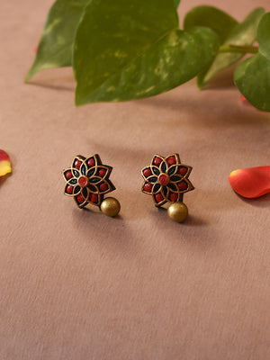 Rudrakshika — Black Red Gold Floral Mandala Work Handmade Terracotta Stud Earrings