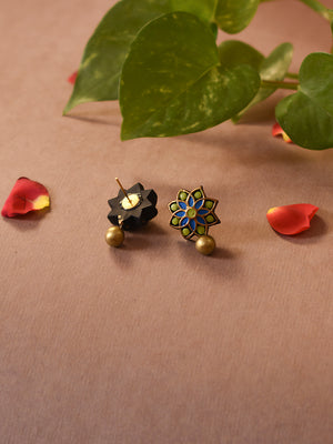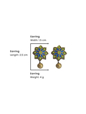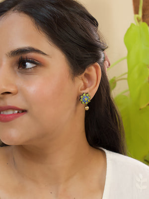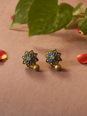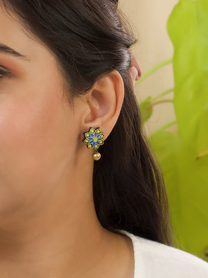 Blue Lime Green Antique Gold Floral Mandala Work Handmade Terracotta Stud Earrings