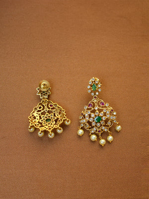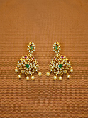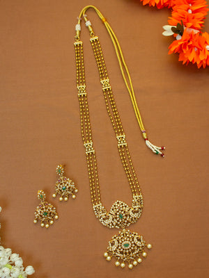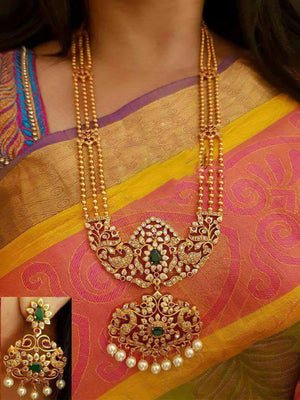 Rich Gold Plated American Diamond Bridal Necklace Set with Pearls in Green stones Classic Peacock design