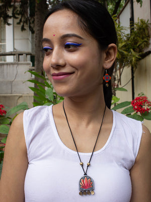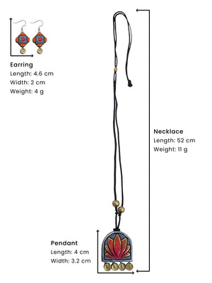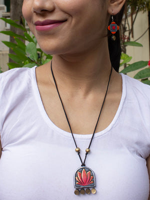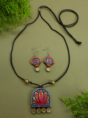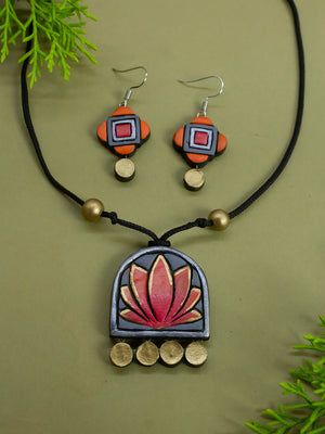 Lotus Design Grey Orange Antique Gold Handmade Terracotta Necklace Set