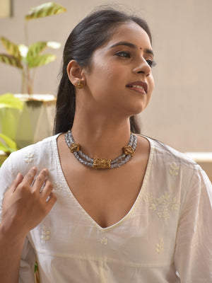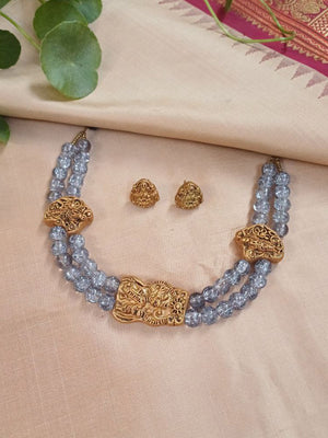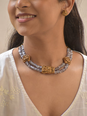 Crystal Beads Twin Strand Terracotta Necklace Set with Antique Gold Tribal Motifs & Stud Earrings