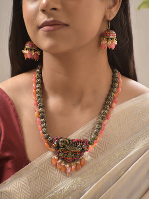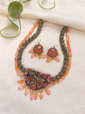 Divine Lord Vishnu Terracotta Necklace Set with Ethnic Beaded Accents – Black & Orange Earrings