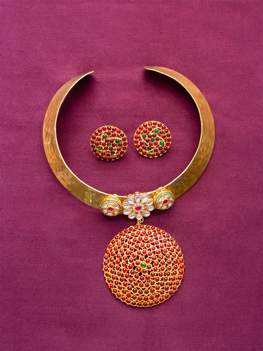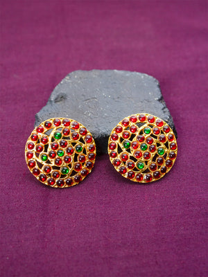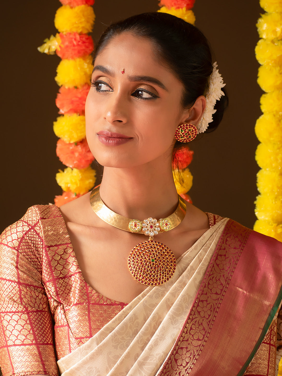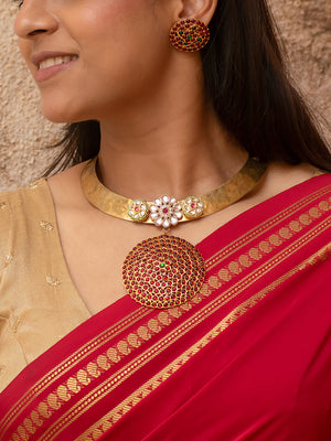 Shringaara - Premium Gold Finish Temple Necklace Set-Round Red Green and Kundan Stones