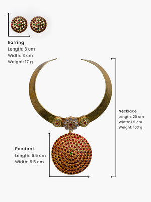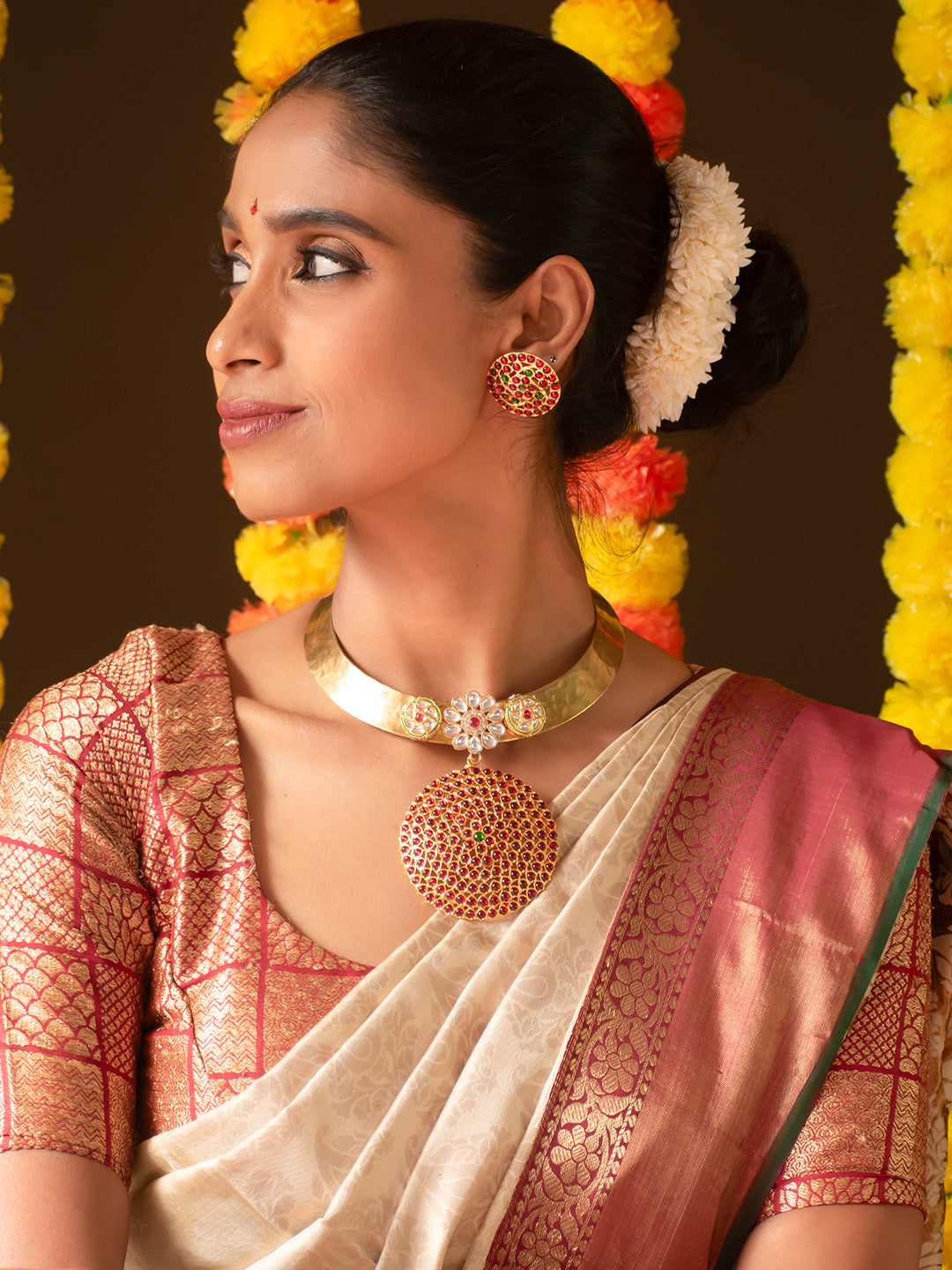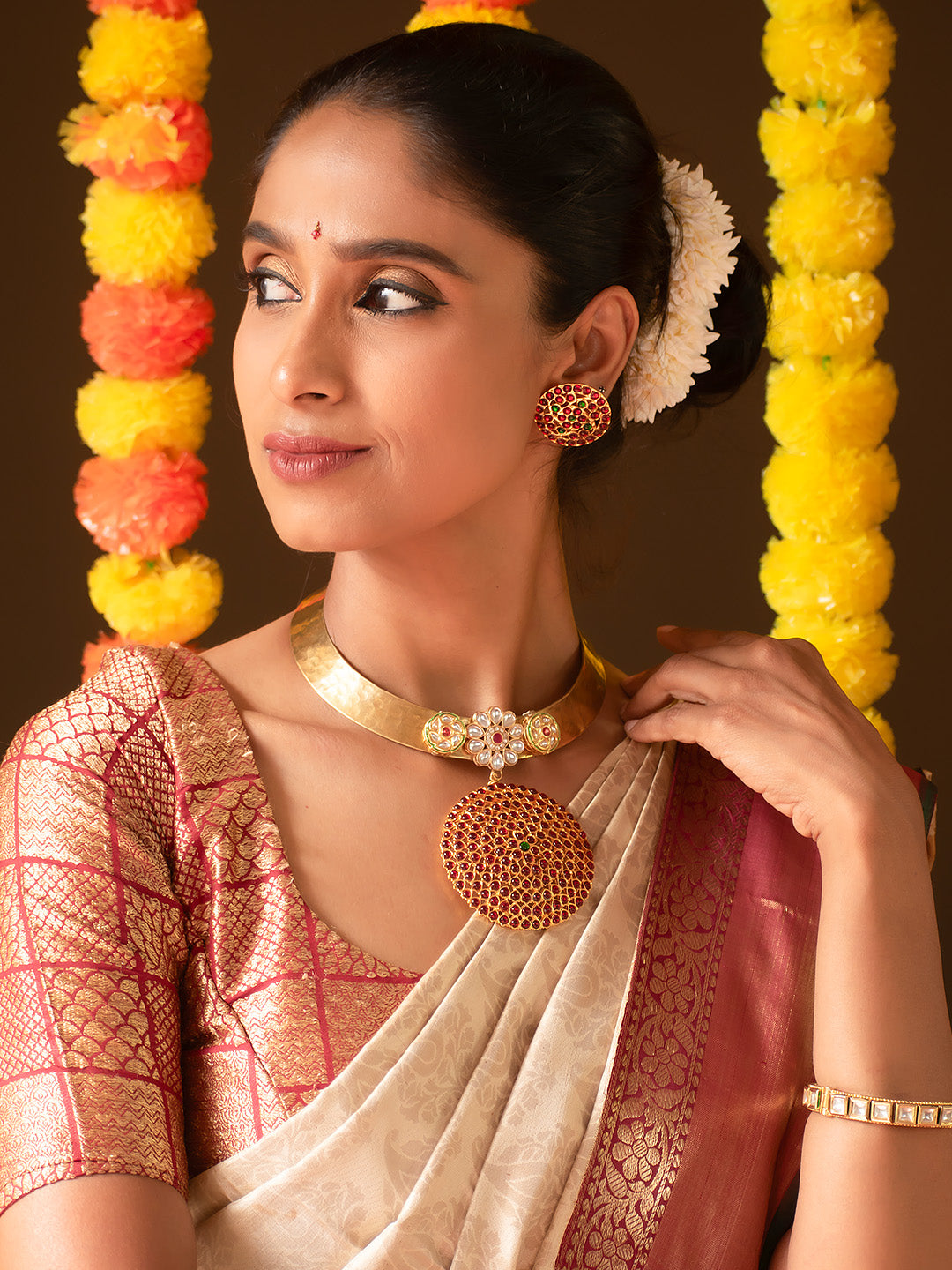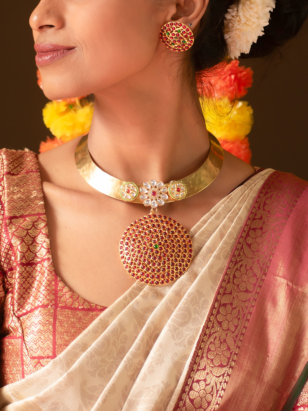 Shringaara - Premium Gold Finish Temple Necklace Set-Round Red Green and Kundan Stones