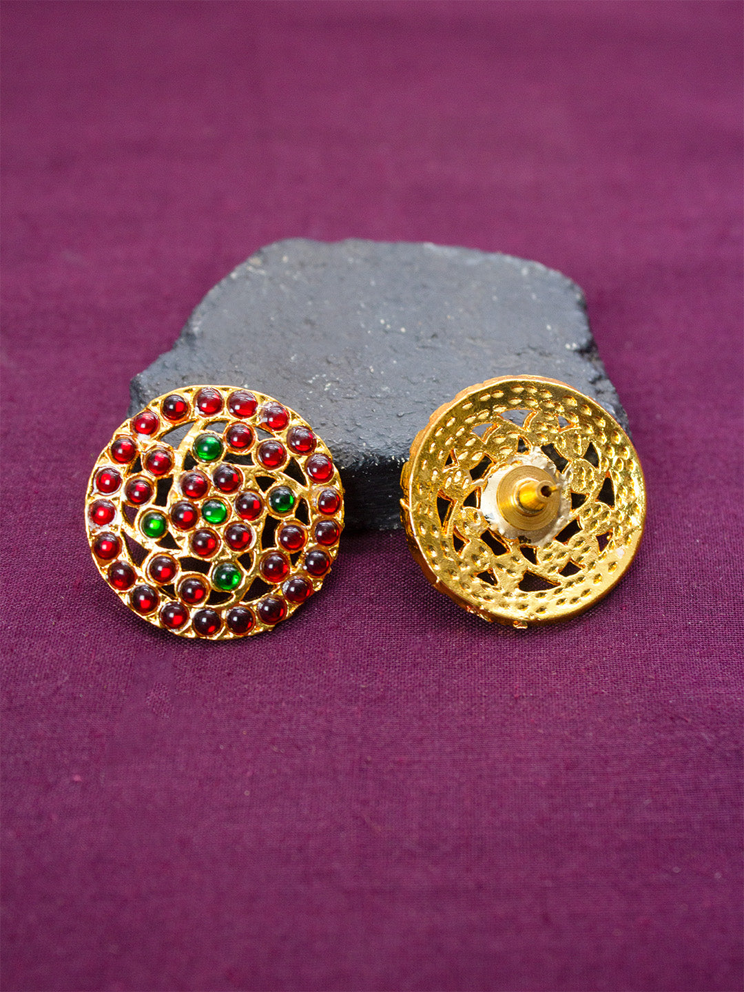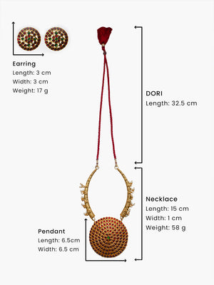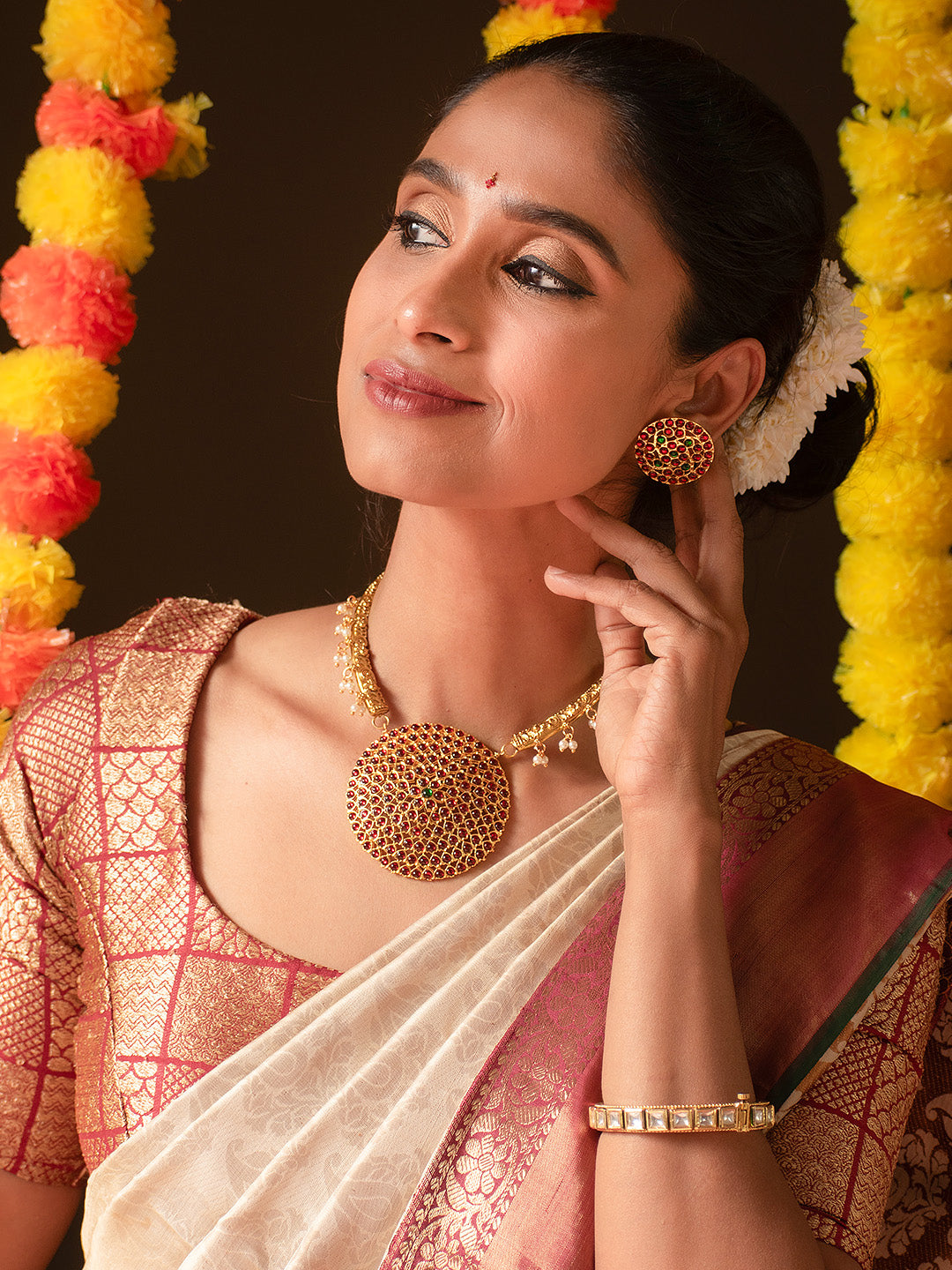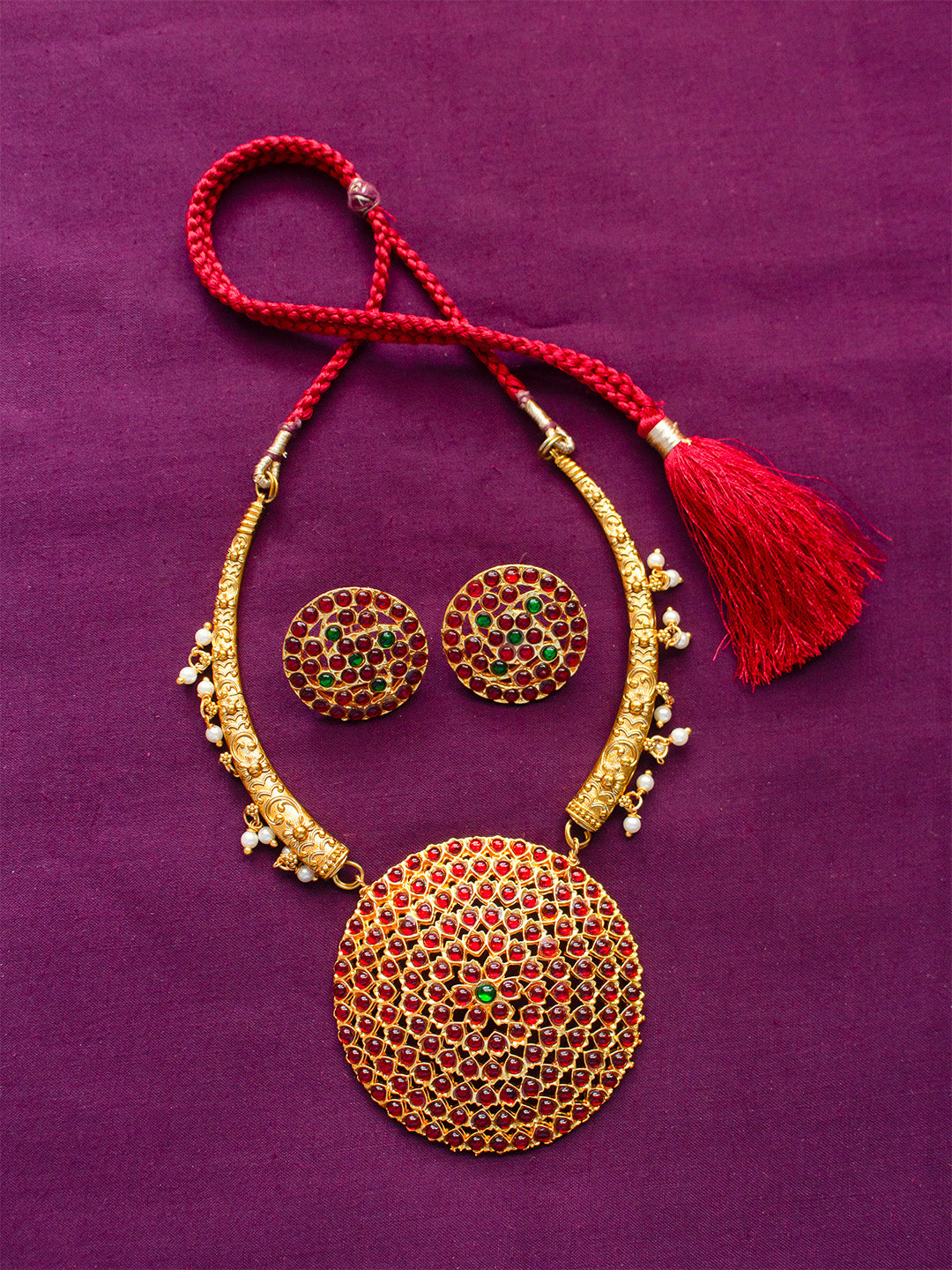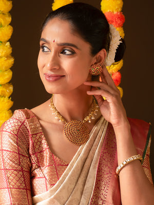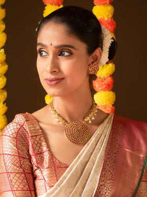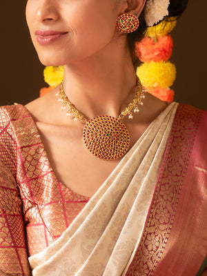 Premium Gold Finish Temple Necklace Set-Round Red Green and Pearls