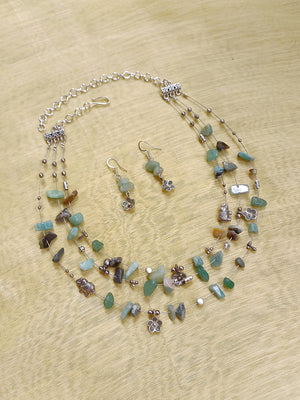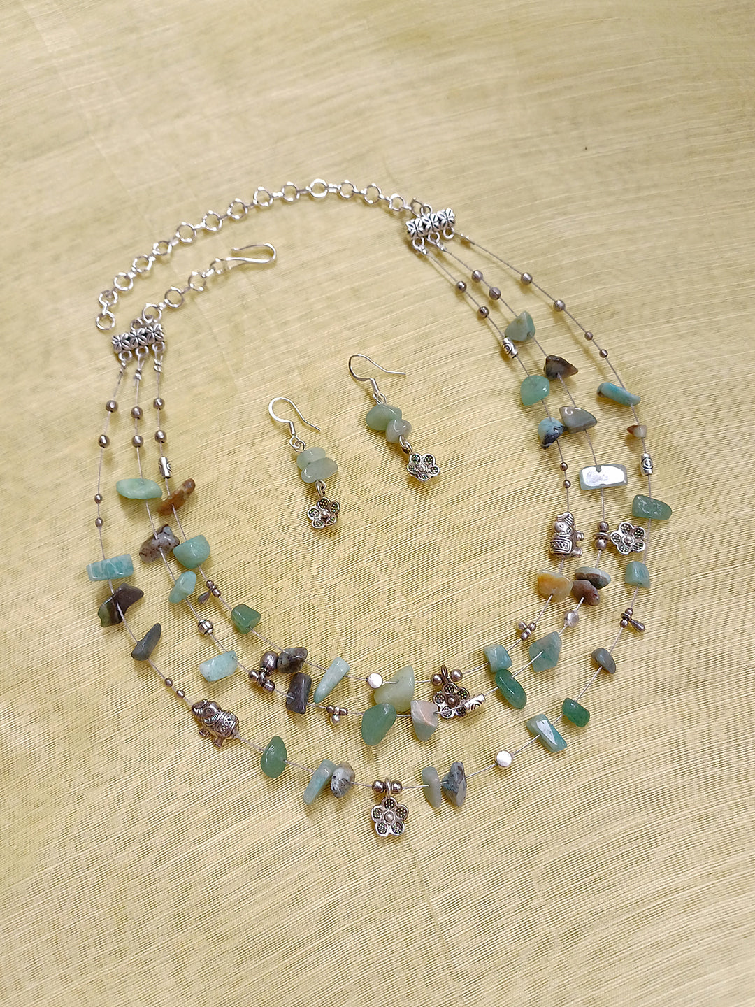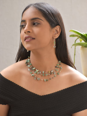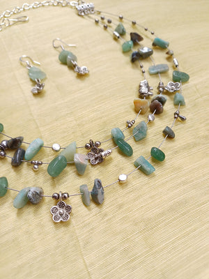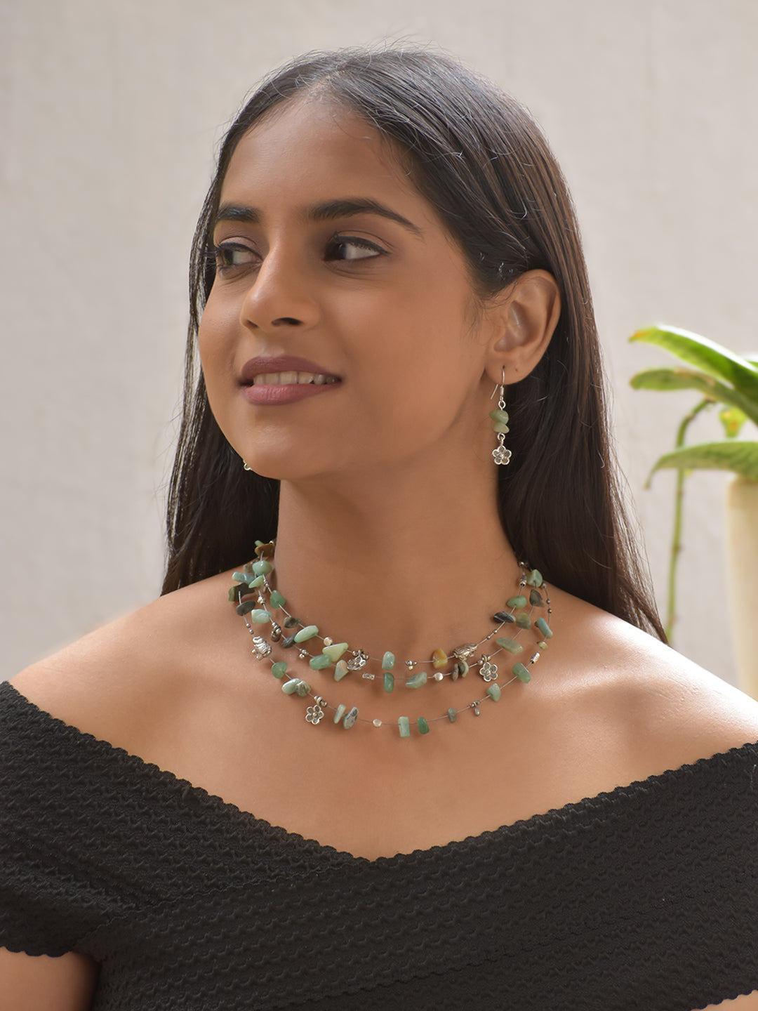 EmeraCharm – Multi-Layer Green Agate Gemstone Necklace Set with German Silver Motifs
