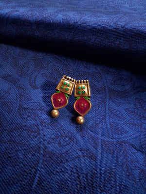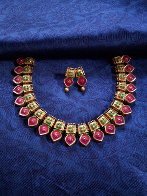 Hand-Painted Terracotta Necklace Set – Antique Gold & Deep Magenta with Emerald Green Accents