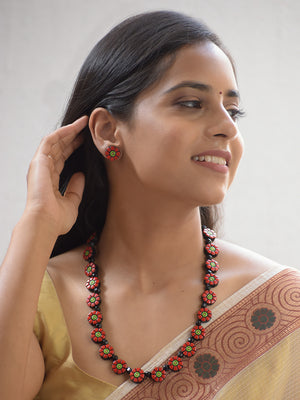 Handcrafted Red Floral Terracotta Jewellery Set with Black Beads