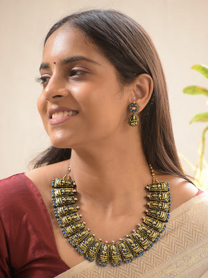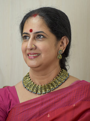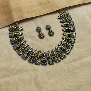 Handcrafted Terracotta Antique Gold Lakshmi Choker Set with Pink & Blue Accents
