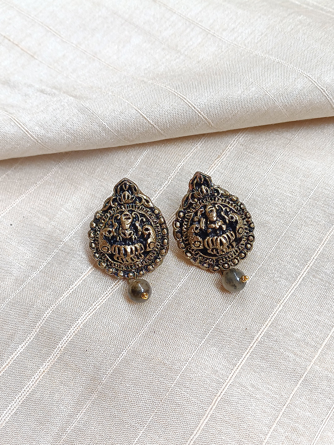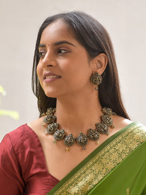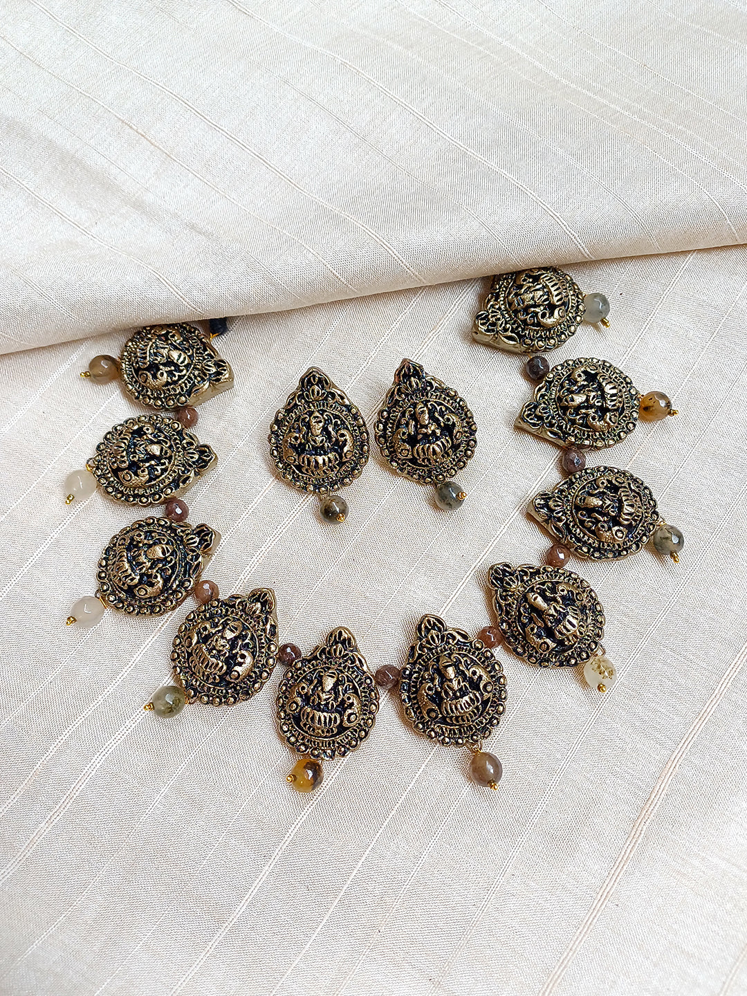 Handcrafted Terracotta Antique Gold Necklace Set with Lord Lakshmi Motifs and Beaded Drops