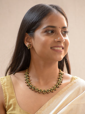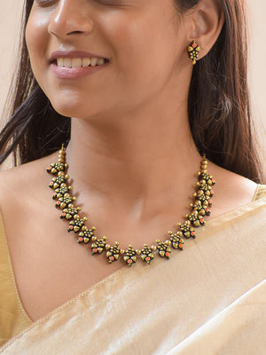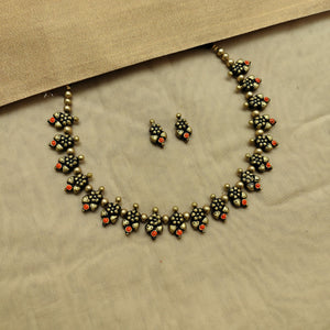 Kumuda — Handcrafted Terracotta Floral Design Necklace Set in Red and Antique Gold with Stud Earrings