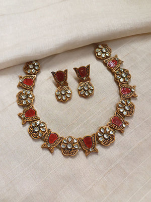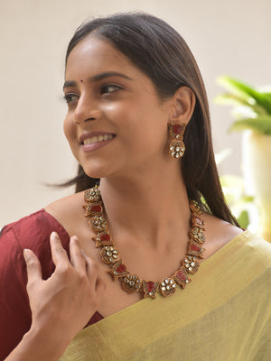 Handcrafted Terracotta Kundan Stones Floral Motif Necklace Set with Earrings – Red & Antique Gold