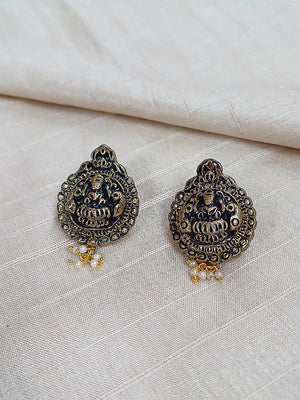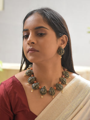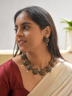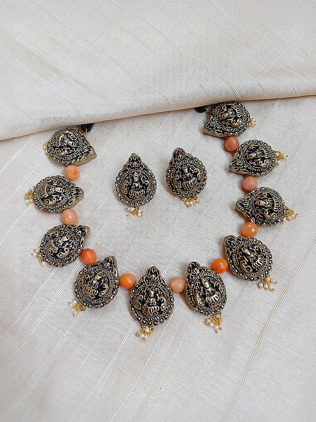 Handcrafted Terracotta Lakshmi Necklace Set with Antique Gold Finish, Orange Beads, and Pearl Danglers