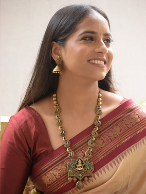 Mayurapriya - Handcrafted Terracotta Lakshmi Pendant Necklace Set with Peacock Links and Red-Green Stone Work and Matching Earrings