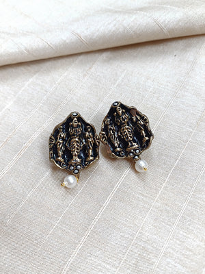 Handcrafted Terracotta Lord Venkateshwara Necklace Set with Antique Gold Beads, Purple Accents, and Pearl Drops