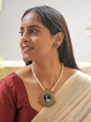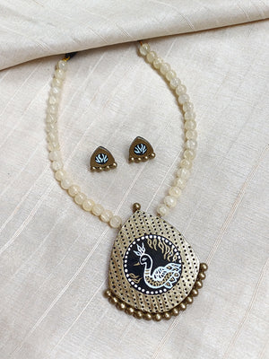 Handcrafted Terracotta Peacock Pendant Necklace Set with Cream Beads and Stud Earrings
