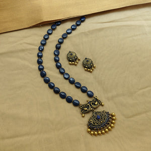 Home Handmade Terracotta Blue Beaded Peacock Pendant Necklace Set with Stud Earrings in Antique Gold