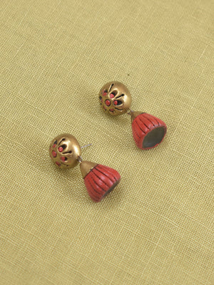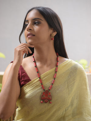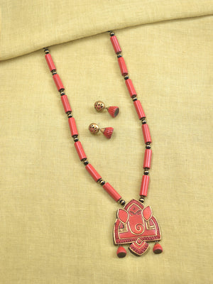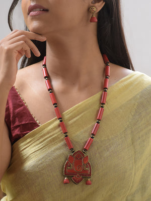 Vinayaka - Handmade Terracotta Ganesha Pendant Set – Red Tube Beads & Antique Gold Charm Matching Earrings