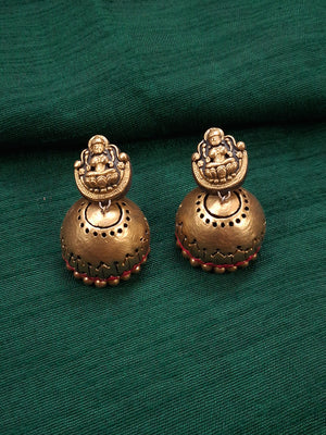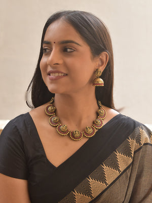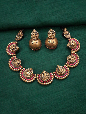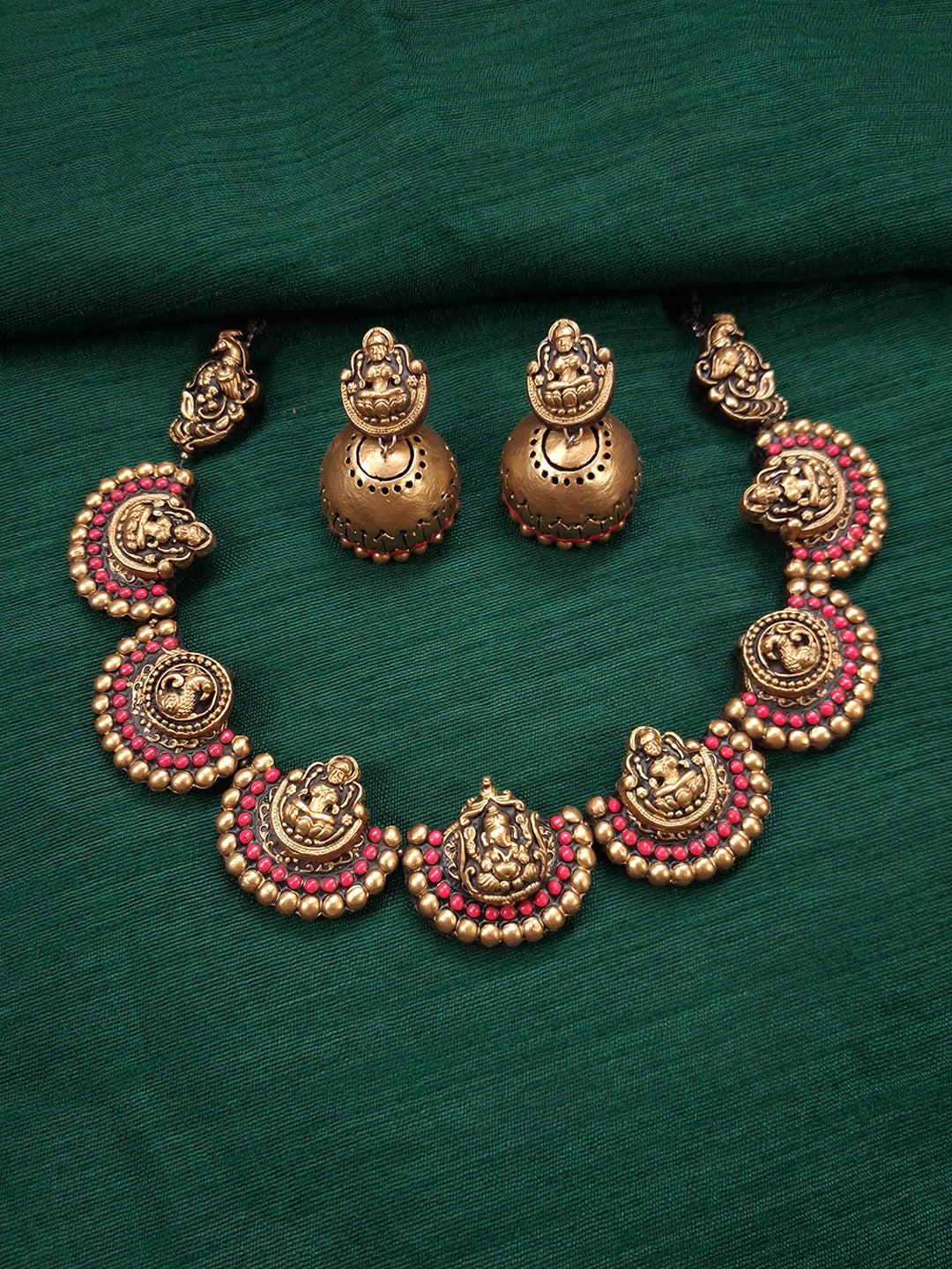 Handmade Terracotta Lakshmi Motif Necklace Set with Antique Gold Beads and Red Accents