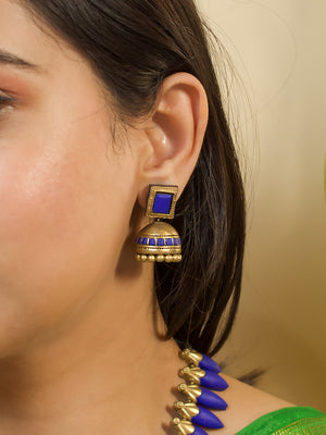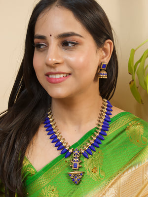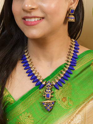 Ink Blue Antique Gold Floral Art Design Contemporary Handmade Terracotta Necklace Set