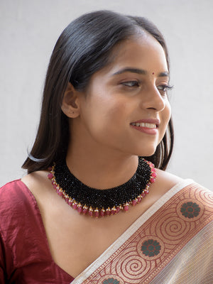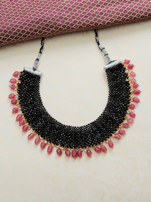 Intricately Woven Black Crystal Choker with Pink Agate Drops