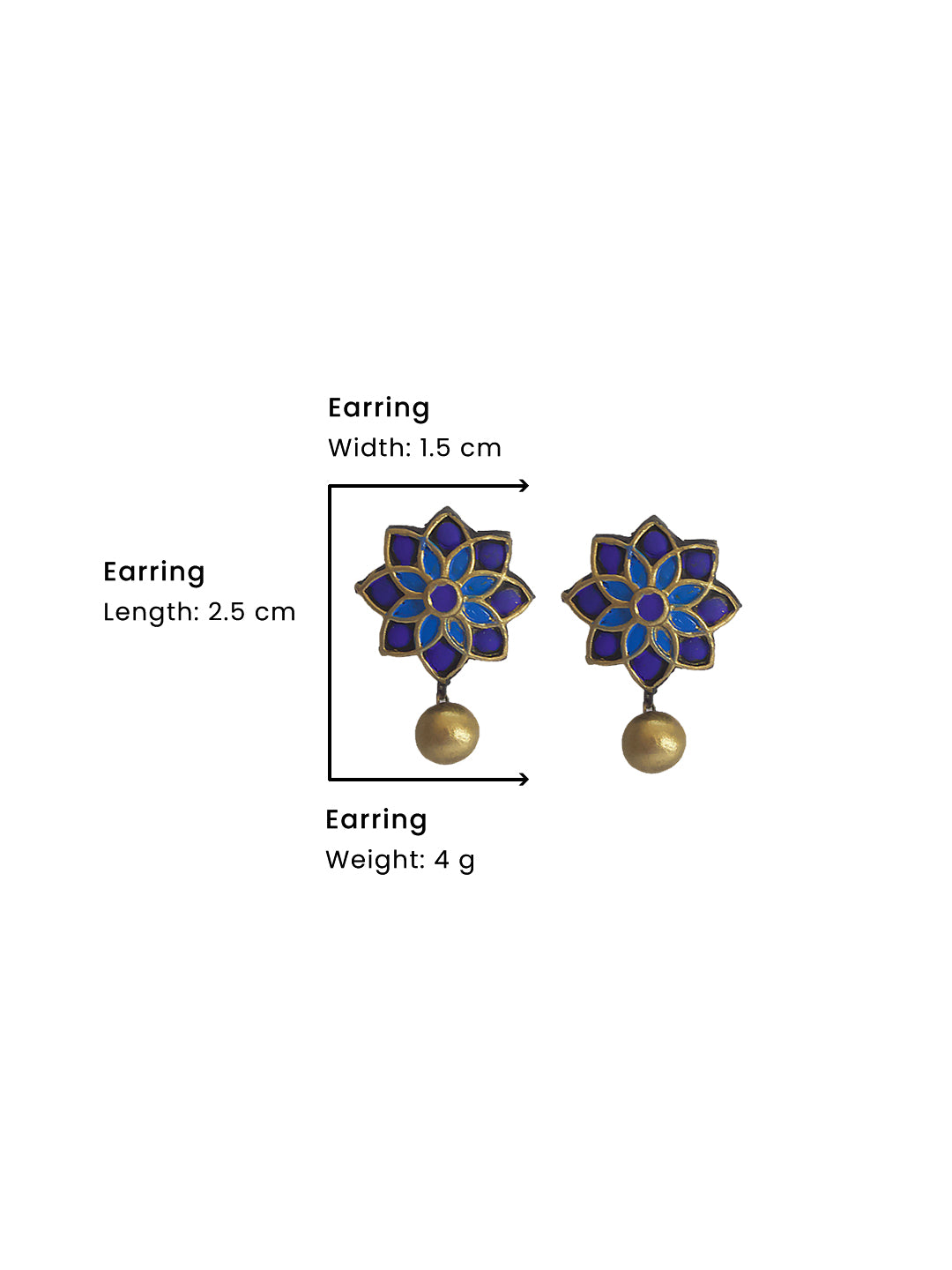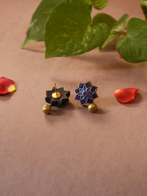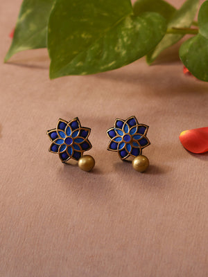 Light Blue Ink Blue Antique Gold Floral Mandala Work Handmade Terracotta Stud Earrings