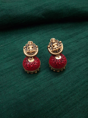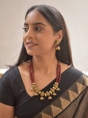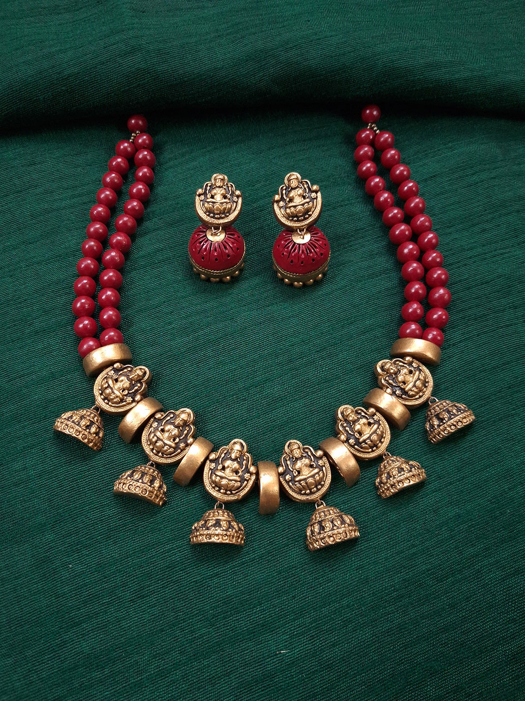 Mahika – Handmade Terracotta Lakshmi Necklace Set with Ruby Beads and Antique Gold Jhumka Earrings