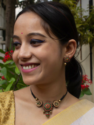 Chakramayura — Mandala Art and Peacock Design Circular Antique Gold Red Green Handmade Terracotta Choker Necklace Set