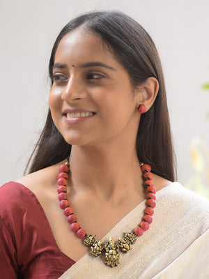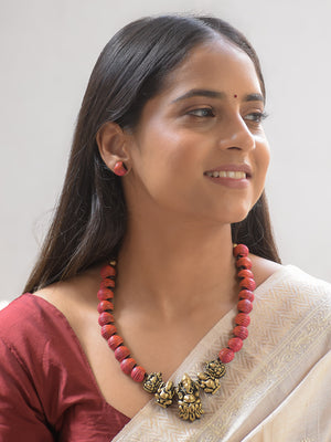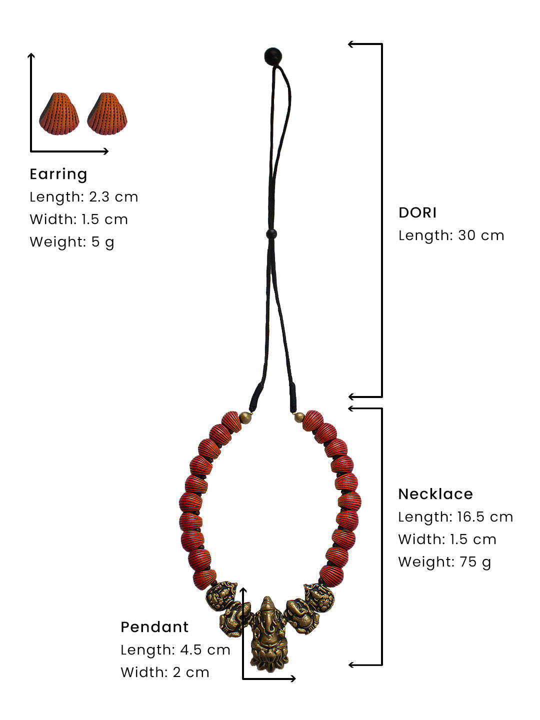 Home Aruna Ganapati — Ombre Shades of Orange Flower Petal Inspired Antique Gold Ganesha Engraved Pendant Handmade Terracotta Necklace Set