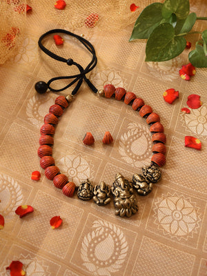 Aruna Ganapati — Ombre Shades of Orange Flower Petal Inspired Antique Gold Ganesha Engraved Pendant  Handmade Terracotta Necklace Set