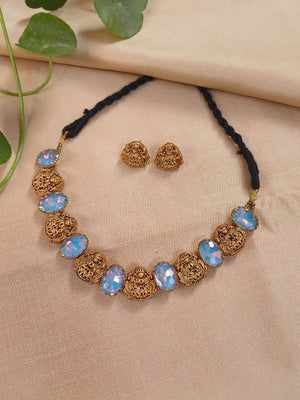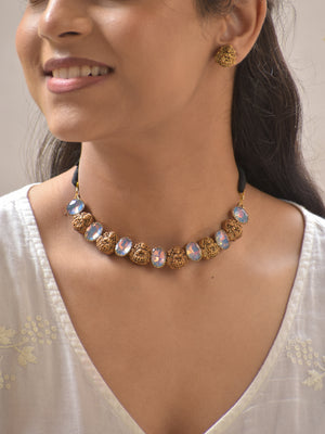 Opalite Shine Terracotta Lakshmi Motfis Necklace Set with Golden Filigree Beads Stud Earrings