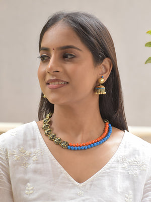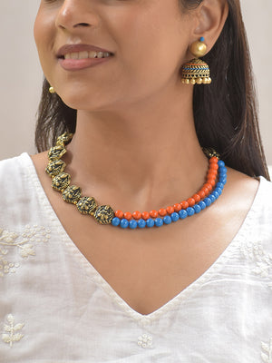 Tarunika - Orange Blue Harmony Antique Gold Terracotta Beaded Necklace Set With Matching Earrings