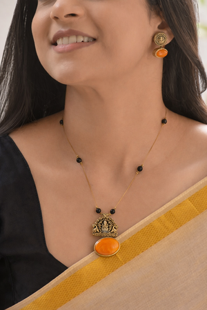 Parvathy — Terracotta Lakshmi Temple Pendant Necklace Set with Black Beads and Bright Orange Stone Highlights