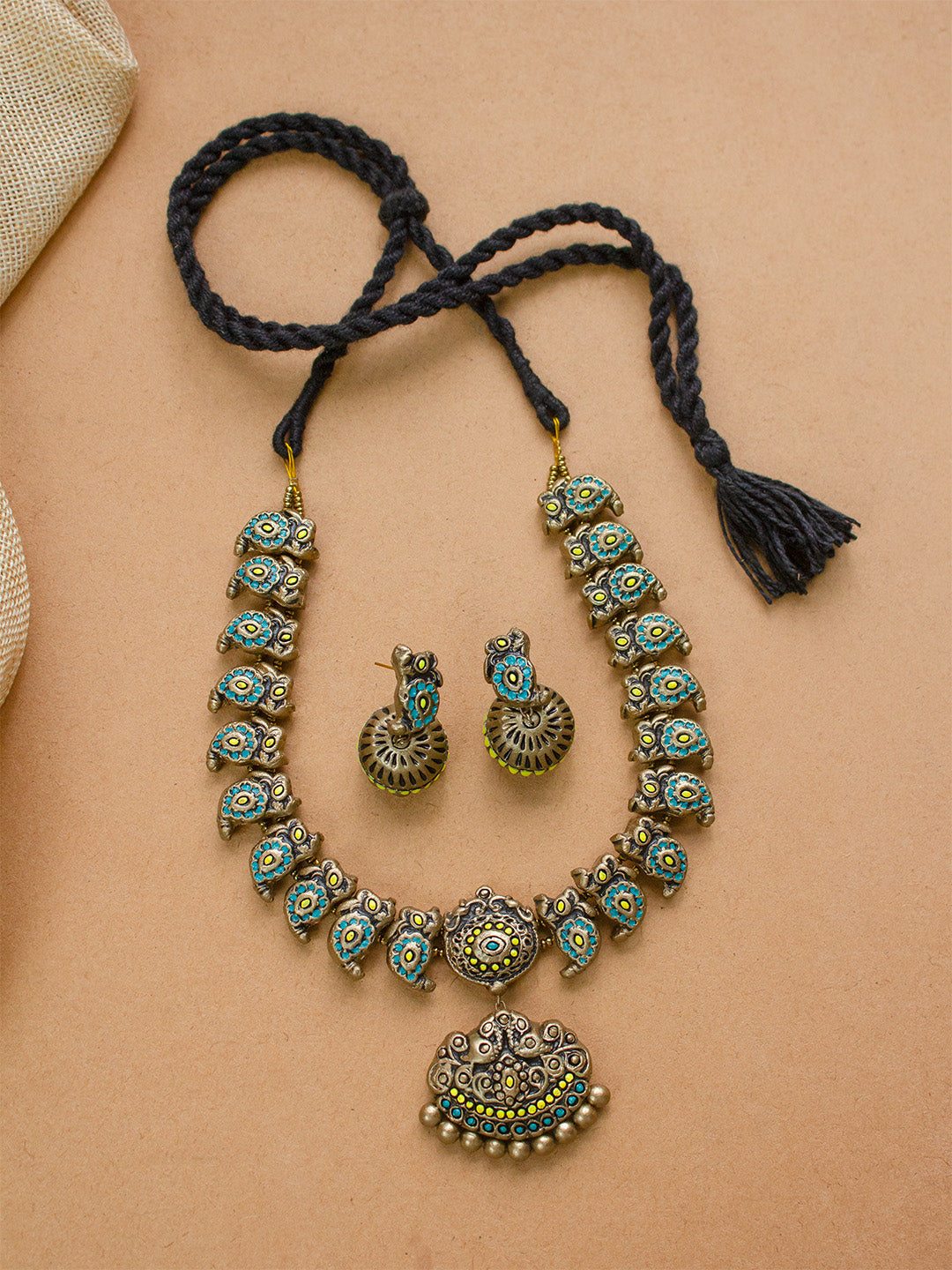 Home Peacock Pendant Choker with Mango Motifs in Yellow and Blue – Handmade Terracotta Necklace Set