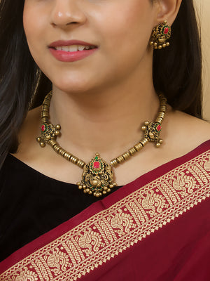 Pink Green Antique Gold Cylindrical Tube Design Peacock Handmade Terracotta Necklace Set
