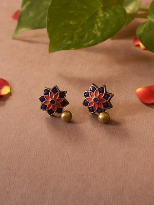 Pink Ink Blue Antique Gold Floral Mandala Work Handmade Terracotta Stud Earrings