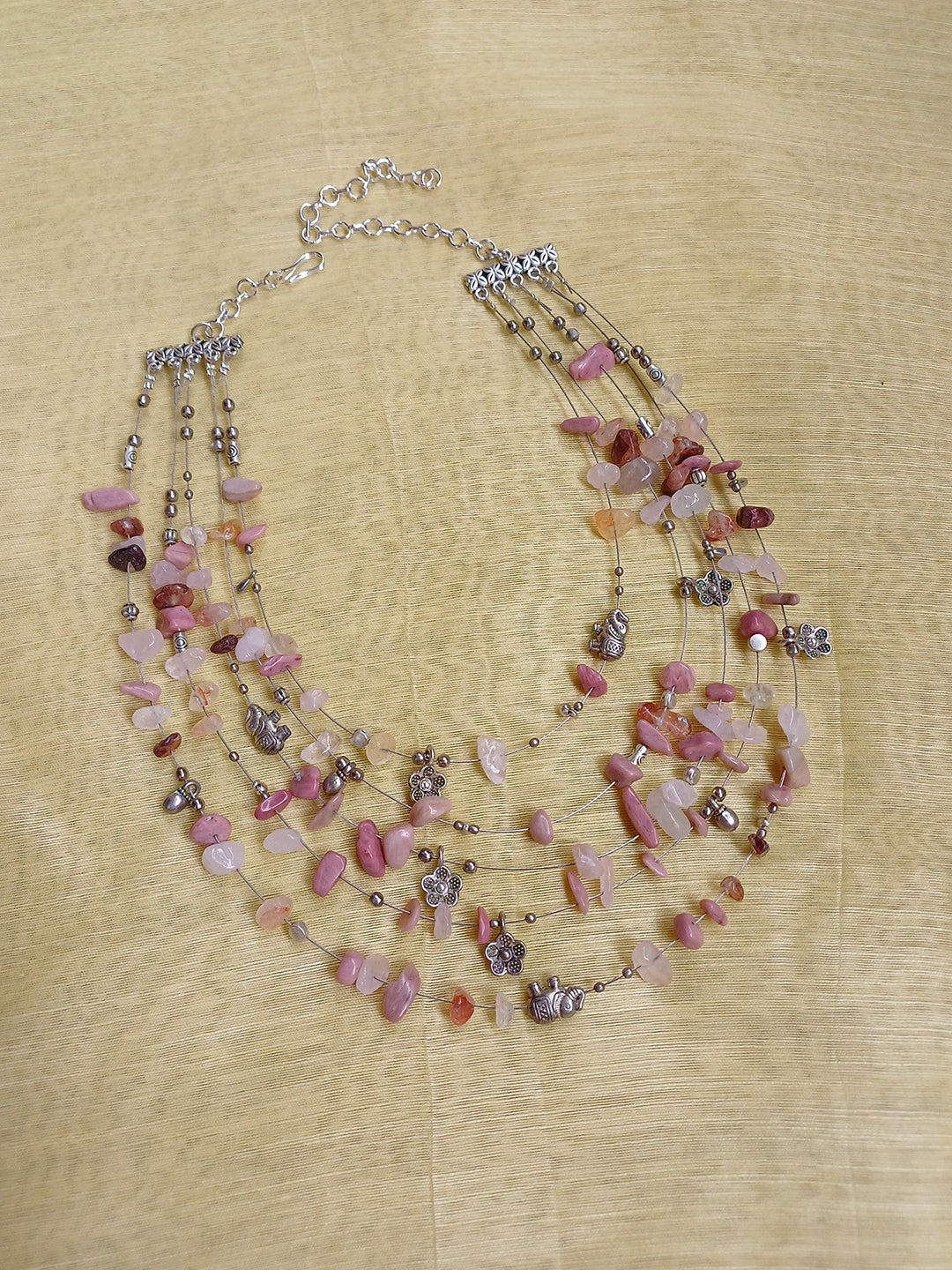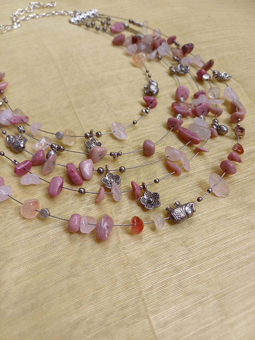 Rosalune – Multi-Layer Pink Rose Quartz Agate Necklace with German Silver Motifs
