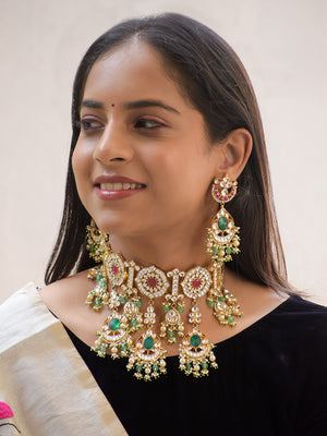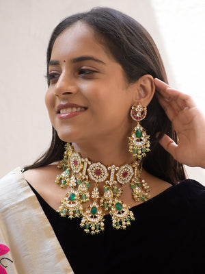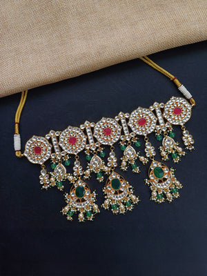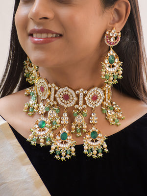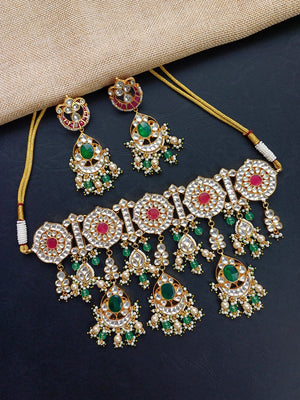 Premium Crafted 18K Gold Plated Bridal Kundan Choker Set with Polki, Gemstones, and Pearls