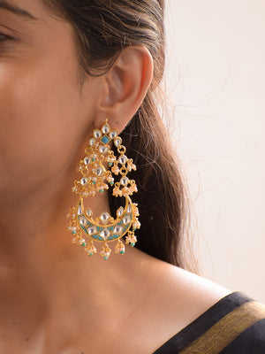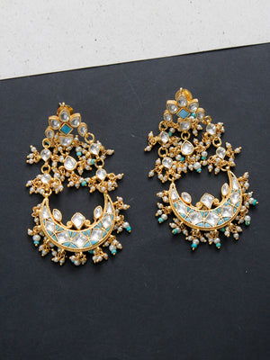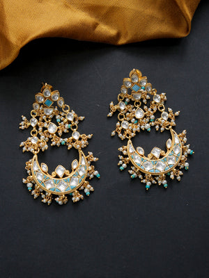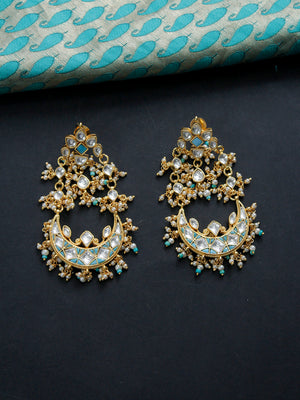 Premium Crafted 18K Gold Plated Firozi Kundan Chandbali Earrings with Pearl Drops