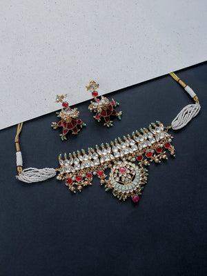 Premium Crafted 18K Gold Plated Kundan Choker Set with Polki, Gemstones, and Pearl Details