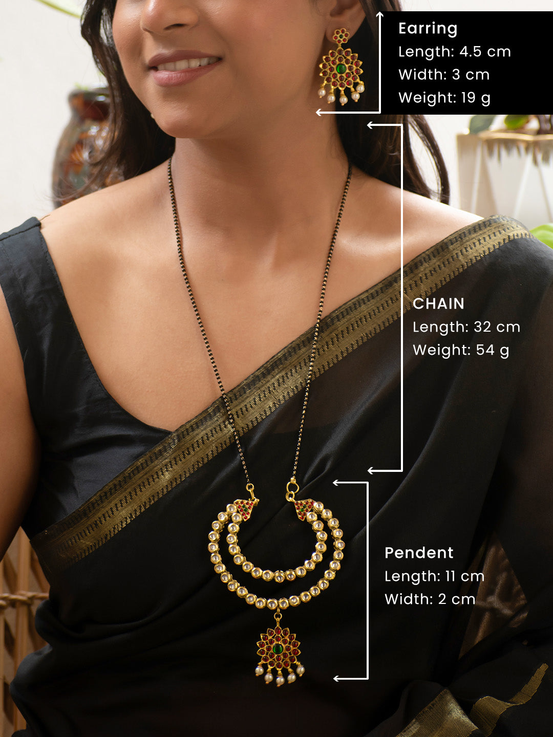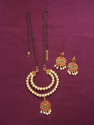 Premium Gold Finish Kundan Stone Red and Green Kemp Stone Temple Necklace Set with Mangalsutra Chain