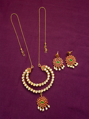 Premium Gold Finish Kundan Stones Red and Green Kemp Stones Temple Necklace Set with Gold Chain