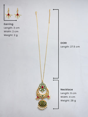 Premium Gold Finish Red Green Kundan Kemp Stone Metal Chain Necklace Set