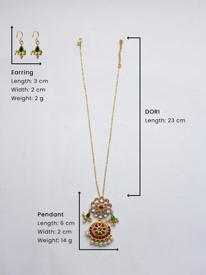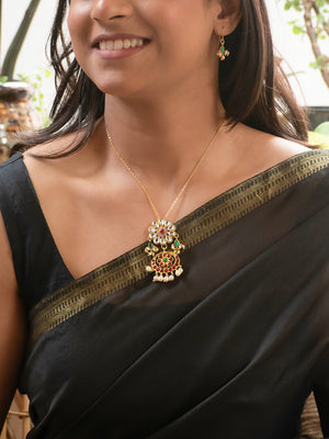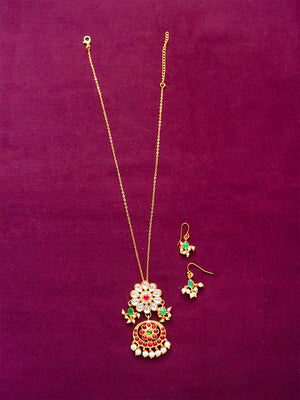 Premium Gold Finish Red Green Kundan Stone Metal Chain Necklace Set