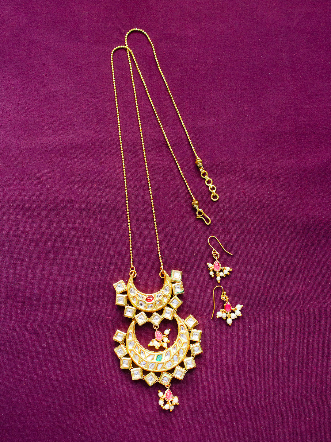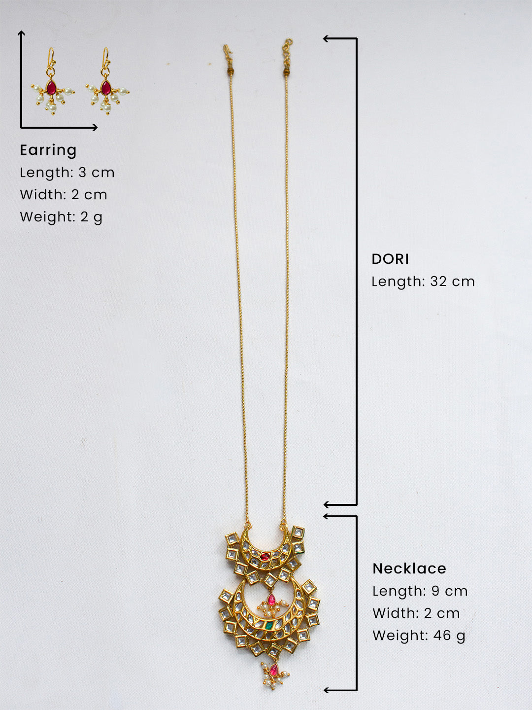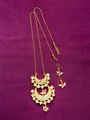 Premium Gold Finish Red Kundan Stone Metal Chain Necklace Set