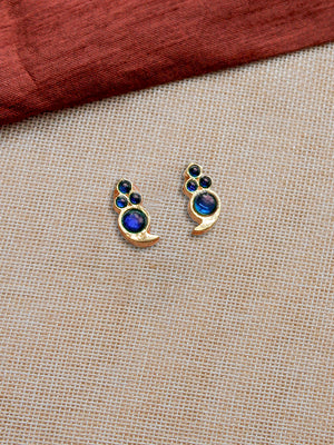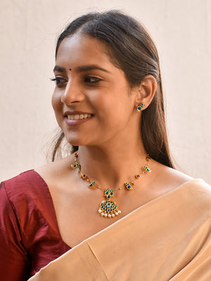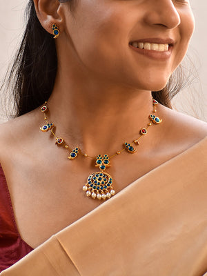 Premium Handcrafted Kemp Mango Necklace Set with Pearl Drops in Blue & Ruby Red Stones
