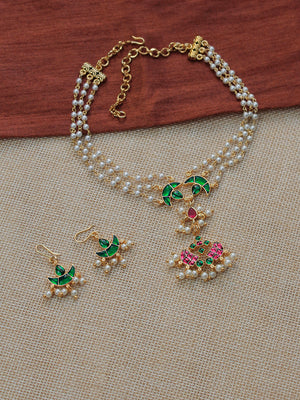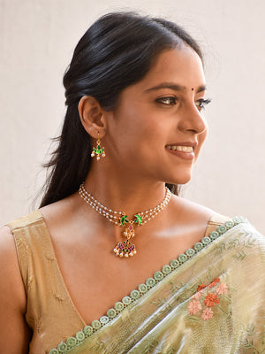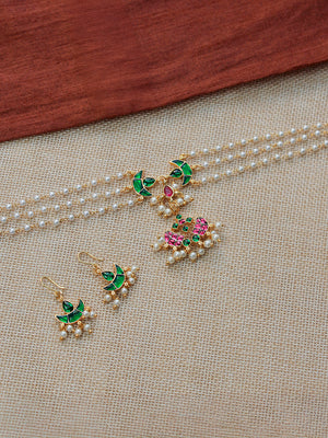 Premium Handcrafted Triple-Strand Pearls Necklace Set with Green & Pink Lotus Motifs Enamel work