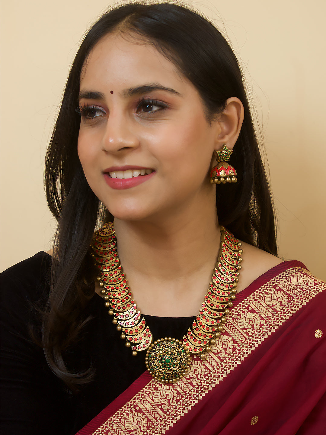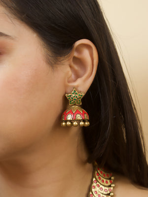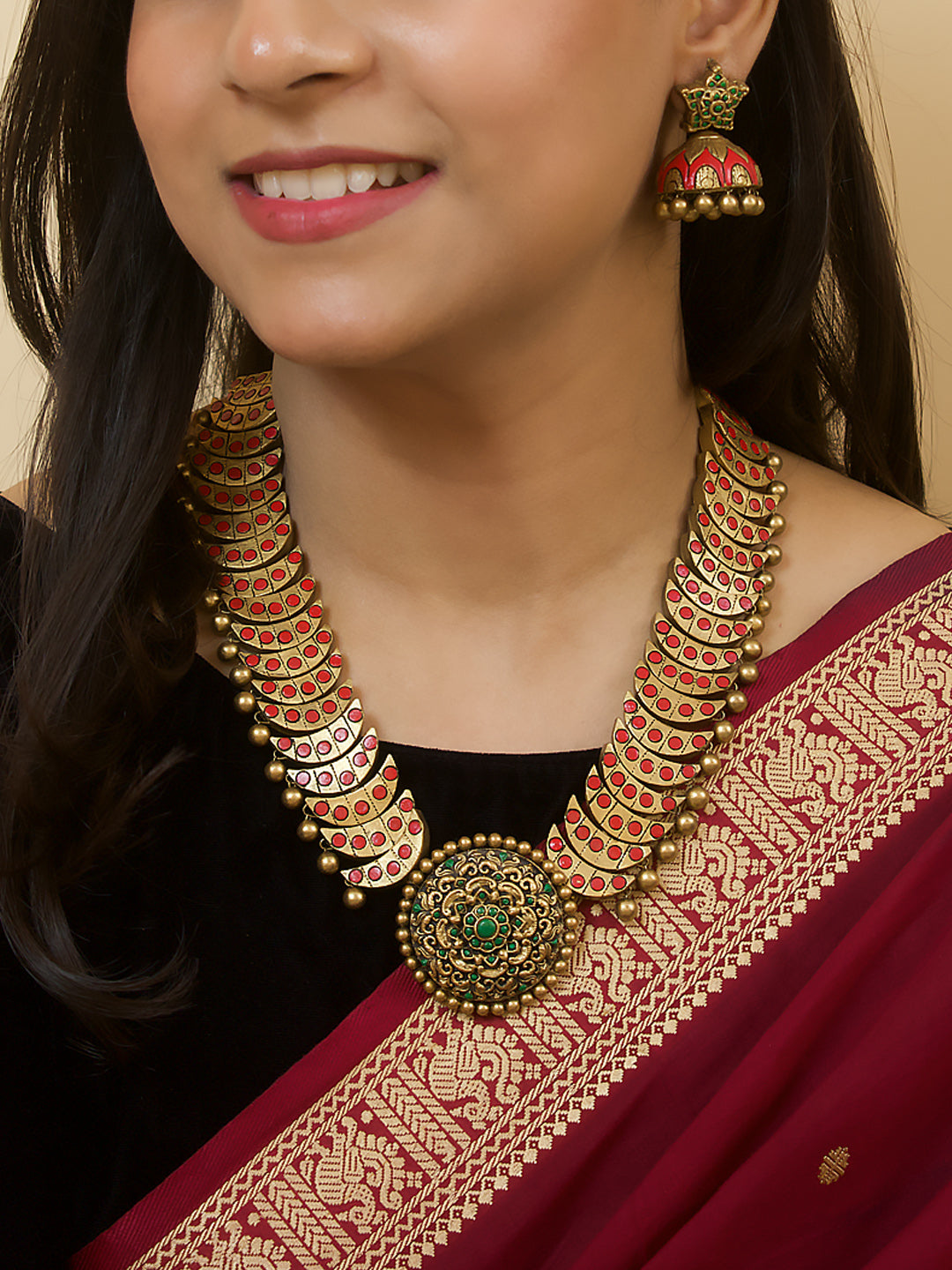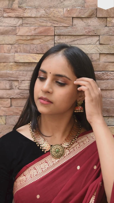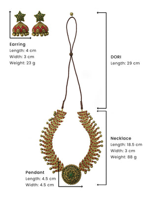 Rajwadi Style Half Moon Design Antique Gold Red Green Handmade Terracotta Necklace Set