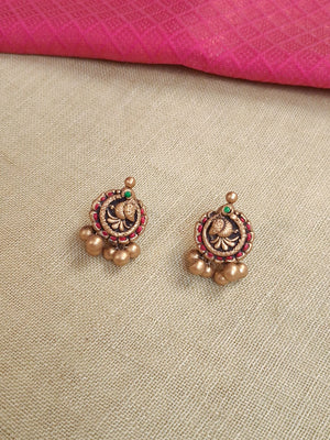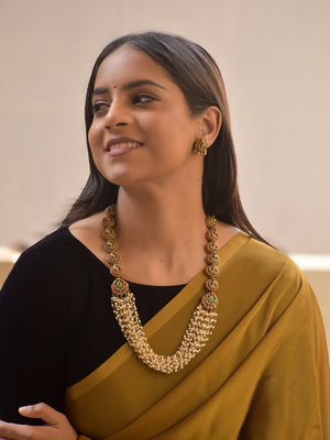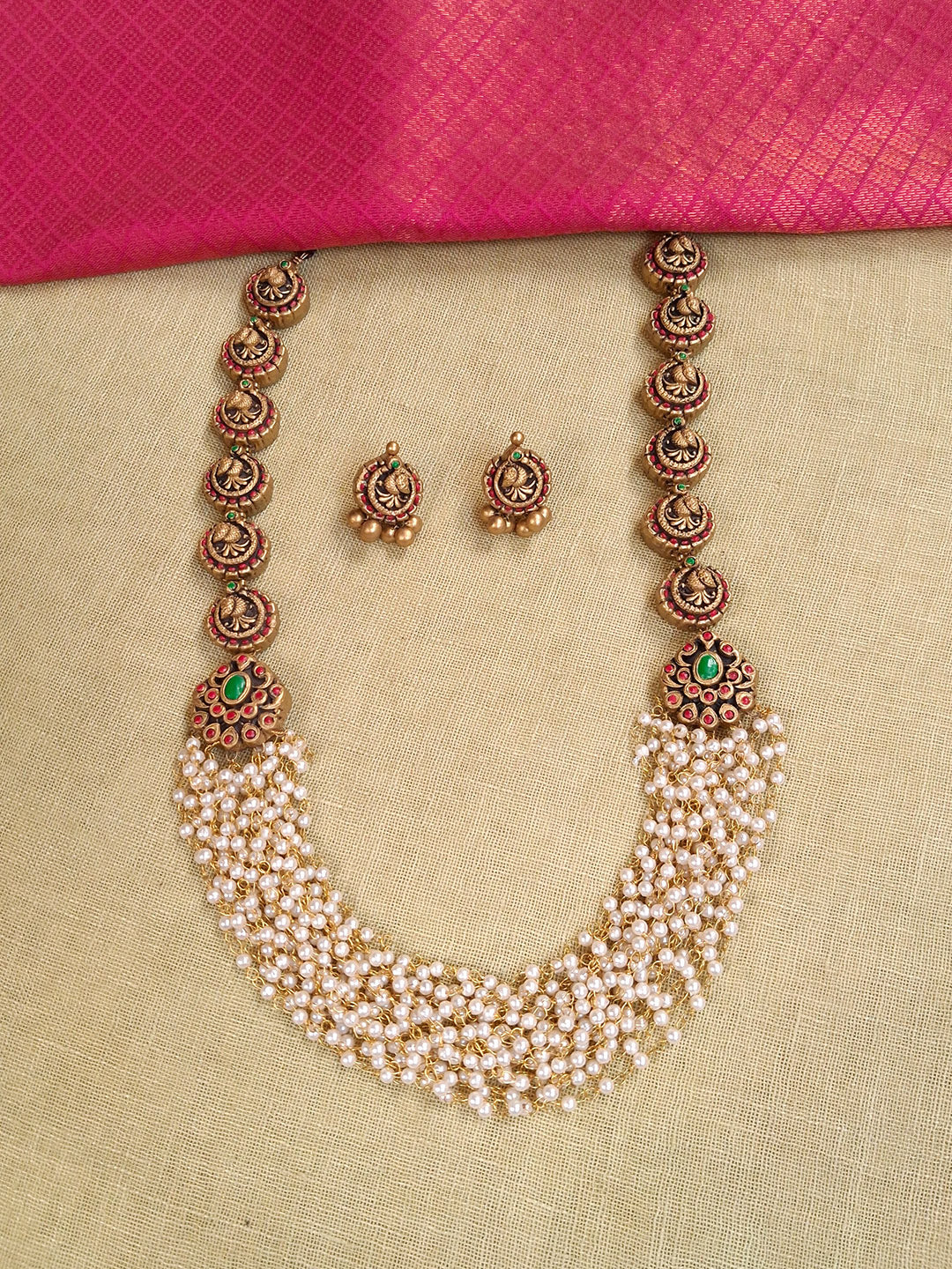 Ratnaveni – Handmade Terracotta Antique Floral Necklace Set with Emerald Detailing and Multi-Layer Pearl Strings