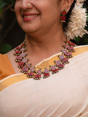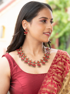 Home Red and Antique Gold Fish and Circular Design Handmade Terracotta Necklace Set